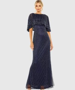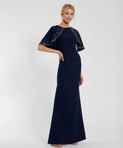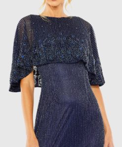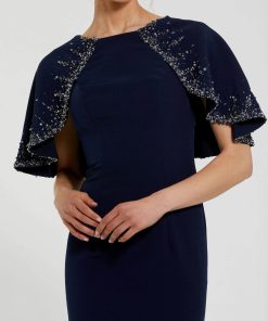 Mac Duggal Women’s Wedding Navy High Neck Column Gown With Embellished Cape | Midnight