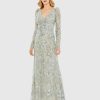 Mac Duggal Women’s Dresses Beige Embellished Mesh Long Sleeve V Neck Gown | Bisque