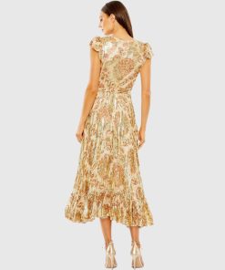 This elegant metallic chiffon floral dress features a flattering V-neck and capped flutter sleeves, adding a soft, feminine touch. The wrap bodice enhances your silhouette, while the cascading waterfall ruffle hem creates beautiful movement and flow. Perfect for weddings, garden parties, or any special occasion.