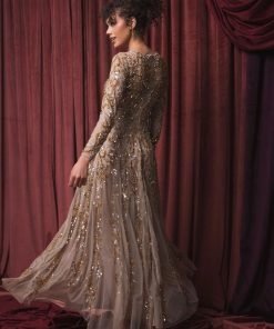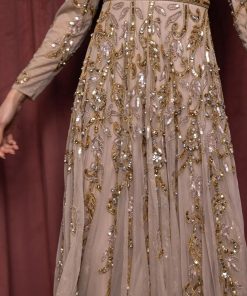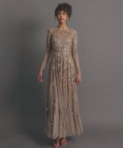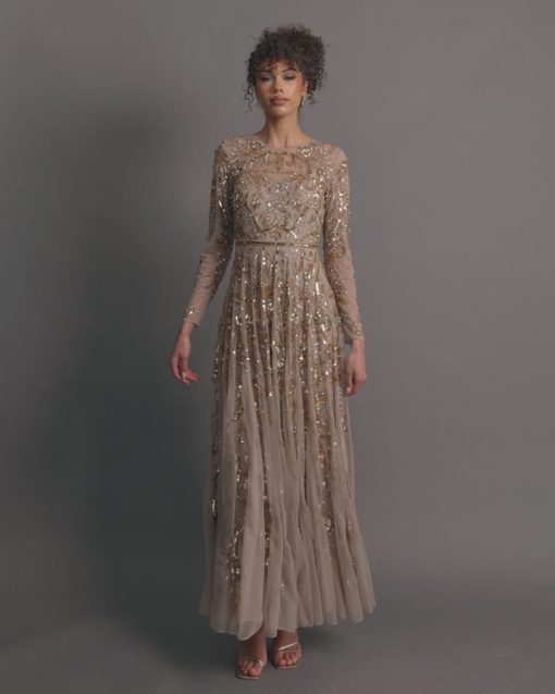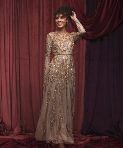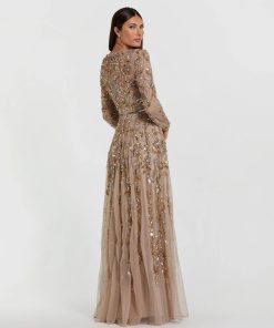 Mac Duggal Women’s Dresses Beige Long Sleeve Hand Embellished Gown | Mocha Gold