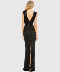 This elegant column gown features a v-neckline and beaded fabric, creating a sophisticated look. The empire waist design flatters the figure and adds a touch of glamour. Perfect for formal events and special occasions.