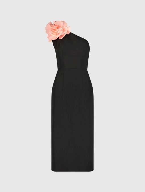 Mac Duggal Women’s Dresses Black Crepe One Shoulder Midi Dress With Flower | Black