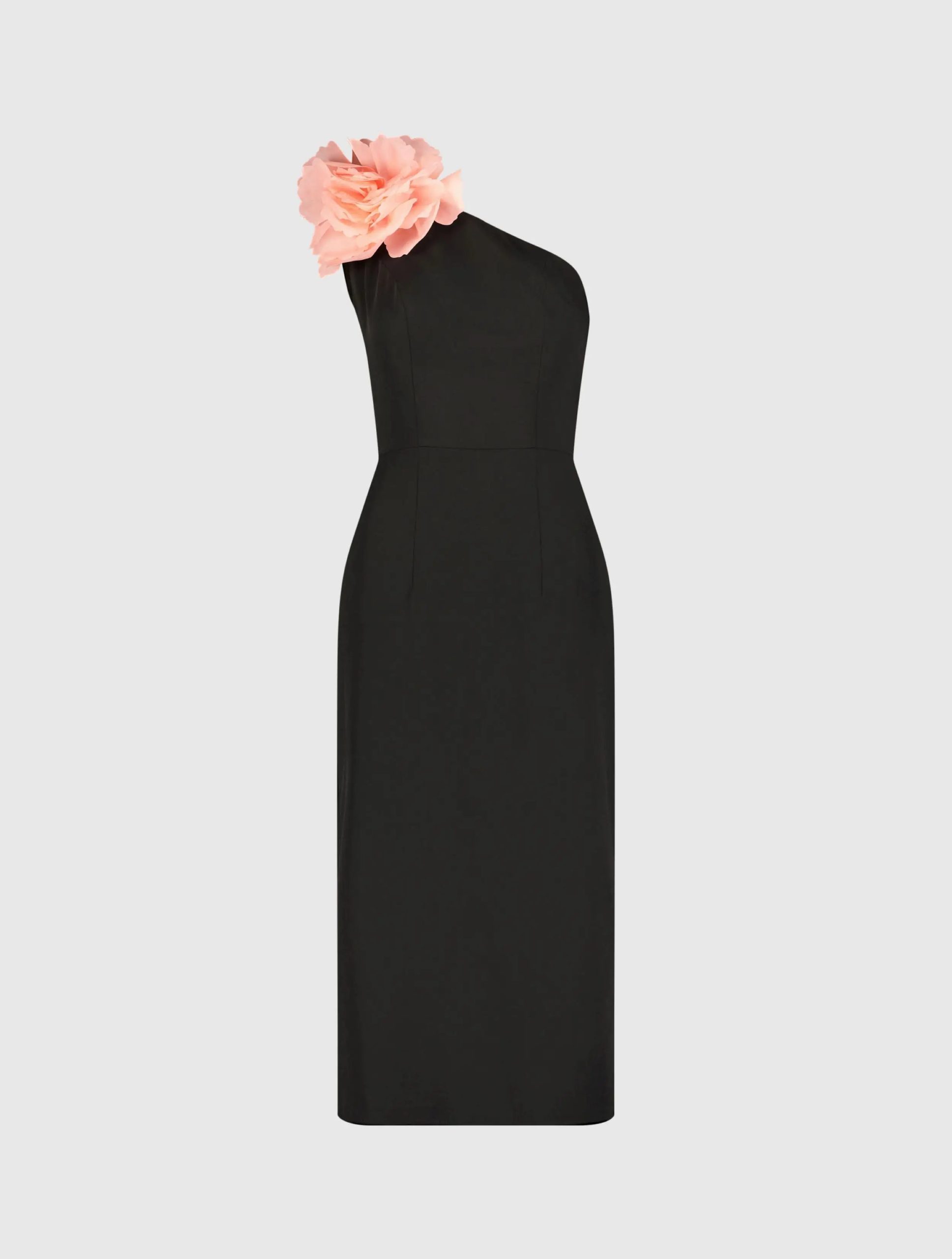 Elevate your everyday or evening ensemble with our Crepe One Shoulder Midi Dress, adorned with an exquisite 3D flower delicately placed on the shoulder. Its sleek column silhouette exudes elegance, while the one-shoulder design adds a touch of confidence and chic flair. Pairs perfectly with heels and a statement bag.