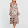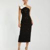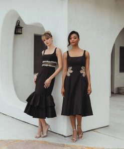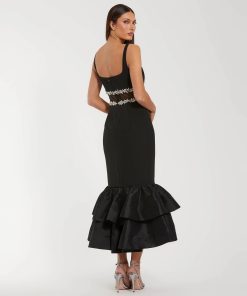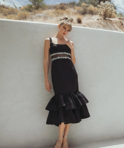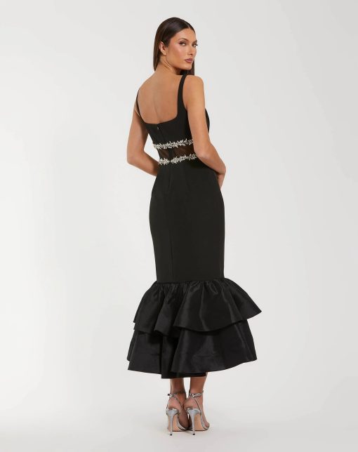 Timeless elegance meets modern flair in this gorgeous midi dress. Crafted from crepe fabric, this dress features a square neckline, shimmering hand-embellished jewels, and a dramatic double-tiered ruffle hem. Perfect for cocktail parties and soirees.
