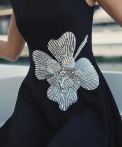 This sophisticated Crepe Mini Dress stuns in bold black, elevated by a rhinestone flower accent that adds the perfect hint of playful glam, made for parties, special occasions, and unforgettable entrances.