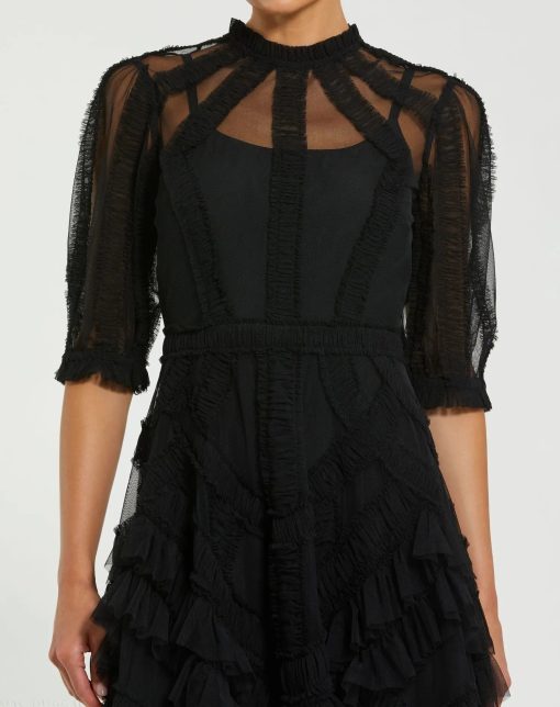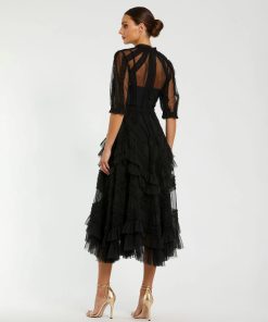 An a-line midi dress with a high neckline, 3/4 sleeves, and tiered ruffles for a graceful, modern silhouette. Perfect for garden parties, brunches, and daytime events.