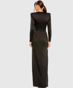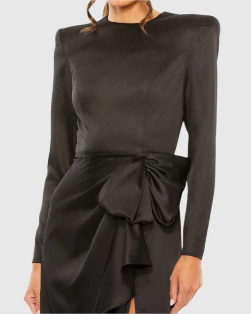 This sophisticated gown features long sleeves for a refined look, while the structured bow adds a touch of modern glamour. The expertly draped silhouette creates a stunning, flowing effect, perfect for formal events, galas, or black-tie occasions.
