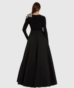 Make a statement at your next special event with this elegant taffeta ball gown. The high neckline and long sleeves exude timeless elegance, while the eye-catching 3D rhinestone flower detail on the shoulder adds a touch of glamour and uniqueness.