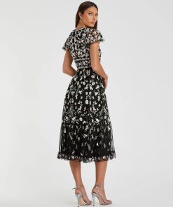 Make an entrance in this stunning embroidered mesh dress, featuring a flattering v-neckline, and delicate ruffle cap sleeves. The allover floral embroidery adds a romantic touch, perfect for garden parties, weddings, and cocktail events.