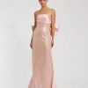 - Vertical seams throughout the bodice and skirt create dramatic movement