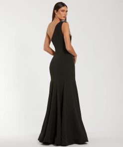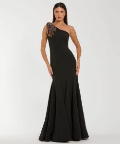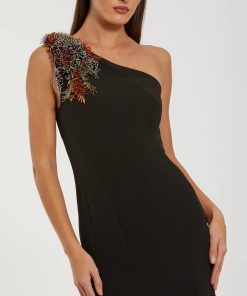 Turn heads in this black one-shoulder mermaid gown with a multicolored beaded shoulder embellishment and sleek asymmetrical neckline. The figure-hugging silhouette flares into a floor-length hem, perfect for weddings, galas, and evening events.