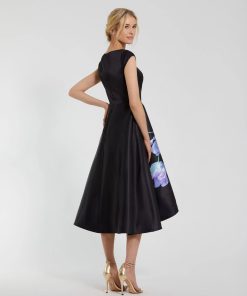 Embrace timeless elegance in this satin cap sleeve dress. Featuring a classic boat neckline, cap sleeves, and a stunning print, it’s the perfect dress for any special occasion.