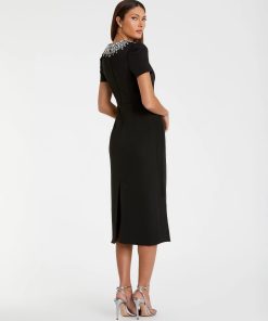 Make a statement in this elegant dress, featuring a hand-embellished collar with beads and encrusted rhinestones, it’s the perfect look for cocktail parties and weddings.