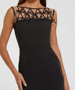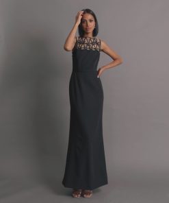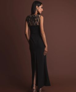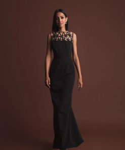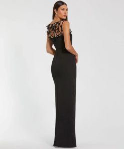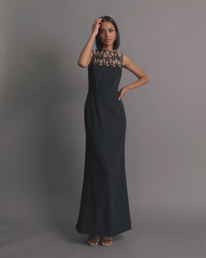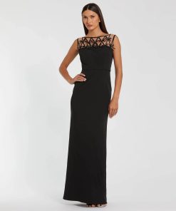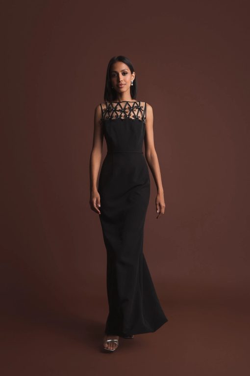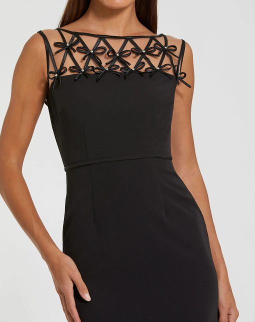 Elevate your evening look in this sleek crepe gown. Delicate satin bows adorn the sheer illusion neckline, adding a modern touch to this timeless silhouette. Perfect for formal occasions, galas, and black tie events, this dress seamlessly blends glamour and sophistication.