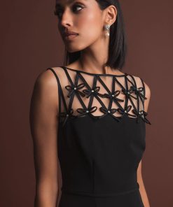 - Intricate lattice neckline with bow appliqué detail