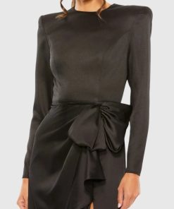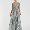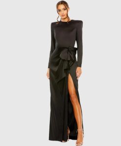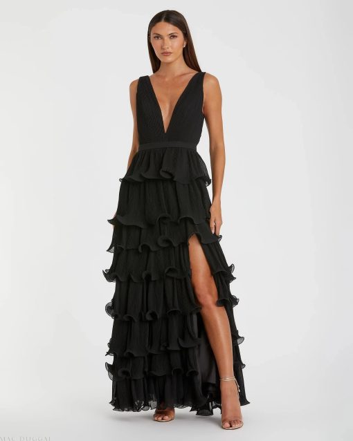 This elegant gown features a plunging V-neckline and a sleeveless design, creating a sleek and sophisticated look. The ruffle tiered skirt adds a touch of femininity and movement, making it perfect for any formal event.
