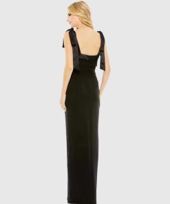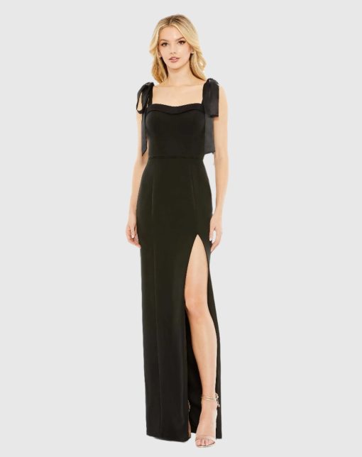 Mac Duggal Women’s Dresses Black Square Neck Tie Strap Slit Gown | Black
