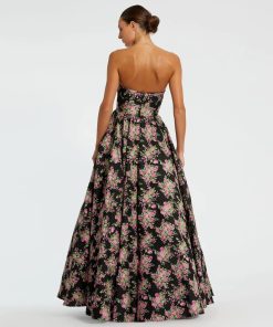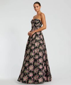 Perfectly tailored classic strapless ball gown with a sweetheart neckline, fitted bodice. The full a-line skirt is layered with tulle for added structure. The full skirt of this gown features pockets. Perfect for any formal occasion.