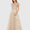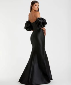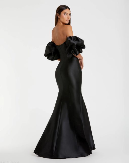 Crafted from elegant satin, this off-the-shoulder gown features puff sleeves and a sweeping train for a timeless silhouette.