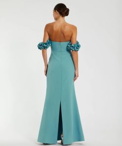 Turn heads in this off-the-shoulder gown, adorned with 3D floral appliqué and finished with a sleek flared silhouette; perfect for formal occasions.