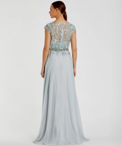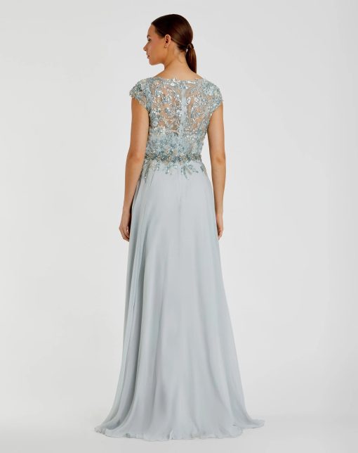 This flowy gown boasts an embellished cap sleeve bodice and flowing chiffon fabric. The thigh high slit adds a touch of elegance, making it a perfect choice for any special occasion. The embellished bodice adds a touch of glamour, guaranteeing you’ll stand out from the crowd.