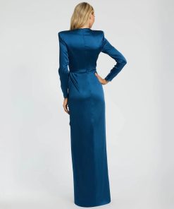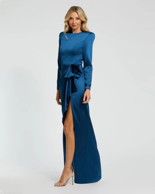 This sophisticated gown features long sleeves for a refined look, while the structured bow adds a touch of modern glamour. The expertly draped silhouette creates a stunning, flowing effect, perfect for formal events, galas, or black-tie occasions.