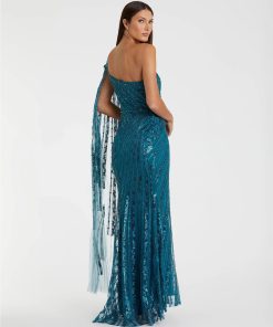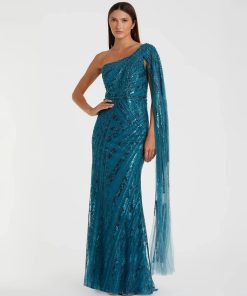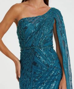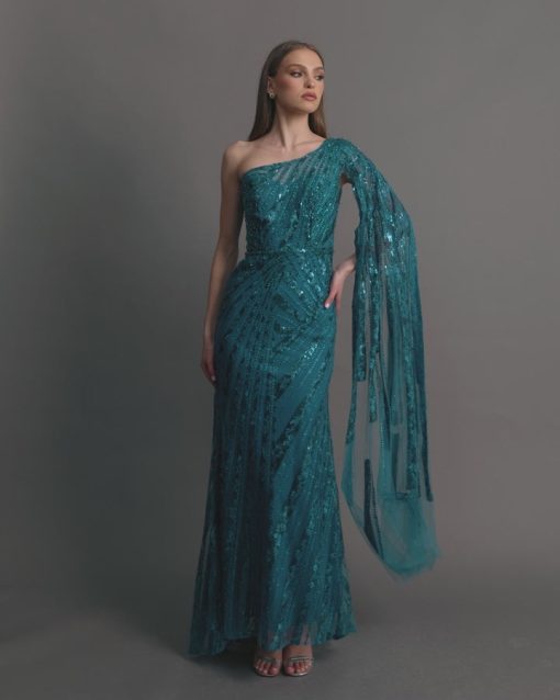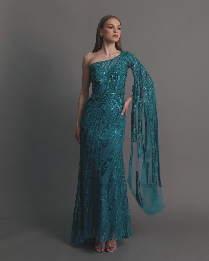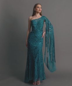Our One Shoulder Cape Sleeve Embellished Gown, a stunning and refined choice. This gown features a chic one-shoulder design with a flowing cape sleeve, adorned with delicate embellishments.