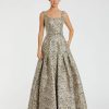 - Vertical seams throughout the bodice and skirt create dramatic movement