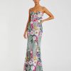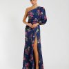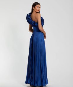 Crafted from luxurious charmeuse fabric, this one shoulder evening gown exudes elegance and sophistication. With a thigh high slit and asymmetrical ruffle neckline, it’s perfect for making a bold statement at any formal event.