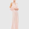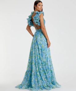 Gorgeous chiffon gown with cut-out sides and back, pleated bodice, and a eye-catching lace-up open back. Dramatic ruffles accent the shoulders, and a flowy tiered skirt completes the look.