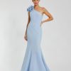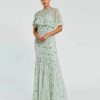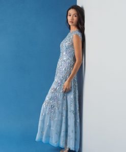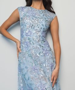 This stunning gown features hand-embellished detailing, a high neckline, and cap sleeves.