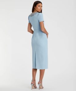 Make a statement in this elegant dress, featuring a hand-embellished collar with beads and encrusted rhinestones, it’s the perfect look for cocktail parties and weddings.