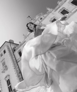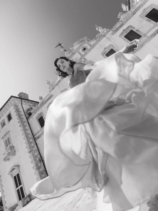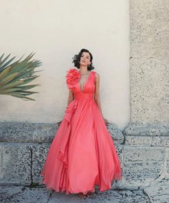 V-neck sleeveless ball gown with ruffled shoulder ruched empire waist and ruffles flowing down the skirt.