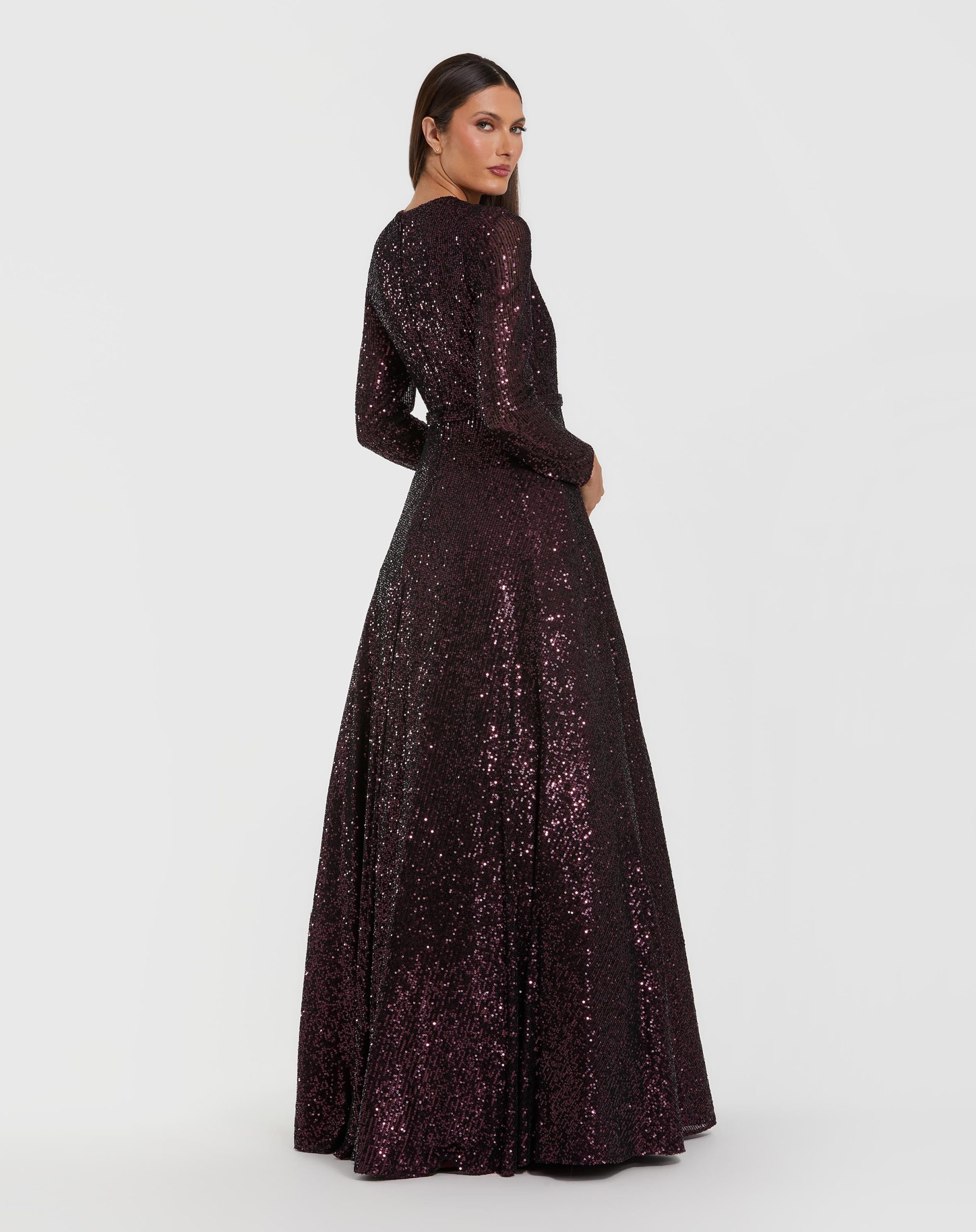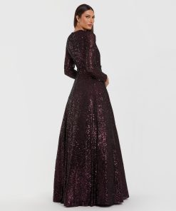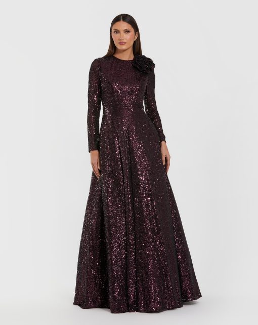 Mac Duggal Women’s Dresses Dark Purple Long Sleeve Sequin Ball Gown With 3d Flower | Purple