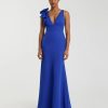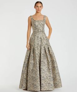Make a statement in this stunning metallic striped gown. Featuring a modern animal-inspired print, chic square neckline, and elegant box pleats, it’s the perfect blend of contemporary flair and timeless sophistication.