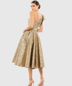 Mac Duggal Women’s Dresses Gold One Shoulder Bow Midi Dress With Pockets | Antique Bronze