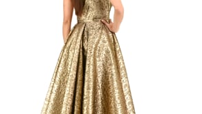 Mac Duggal Women’s Dresses Gold Thin Strap Pleated Metallic Gown With 3d Flower | Antique Gold