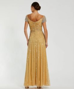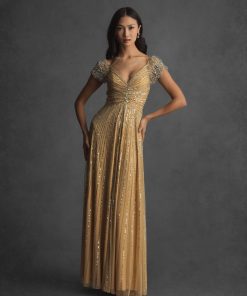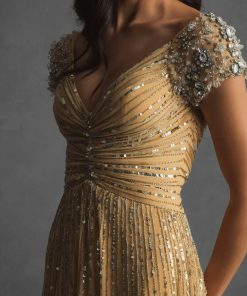 Radiate timeless glamour in this embellished evening gown. Featuring a gathered v-neckline, jeweled cap sleeves, and a cinched bodice, it’s the perfect dress for black-tie events and formal occasions.
