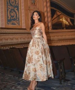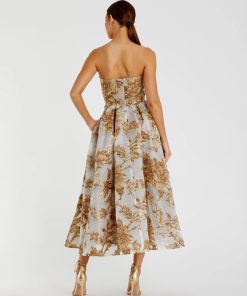 Indulge in luxury in this glamourous brocade midi dress. Featuring a sophisticated strapless neckline, sleeveless design, and pockets, it’s the perfect dress for any special occasion.