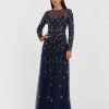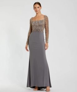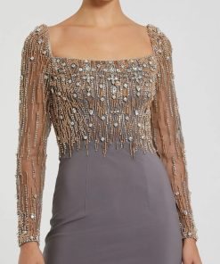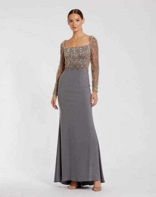 Dazzle in our Beaded Square Neck Long Sleeve Jersey Gown. Featuring intricate beadwork and a flattering square neckline, this gown is perfect for formal events. The long embellished sleeves add a touch of elegance, making it an ideal choice for a stunning and stylish look.