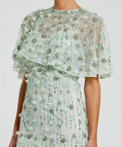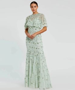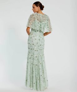 Featuring intricate beading, 3D floral appliqué, rhinestone embellishments, and dramatic illusion cape sleeves, this dress blends elegance and glamour, perfect for galas, awards ceremonies, or red carpet events.
