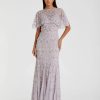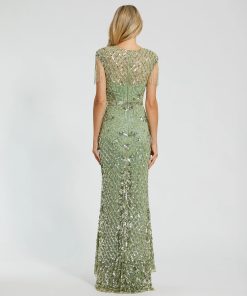 Full length gown with sequins, jeweled tasseled sleeves, and faux belt.