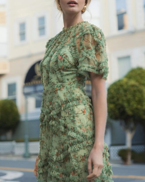 Effortlessly romantic, this flowy floral midi dress features an illusion high neckline, flutter sleeves, and ruffled detailing. Perfect for brunches, garden parties, or daytime celebrations.