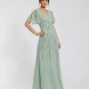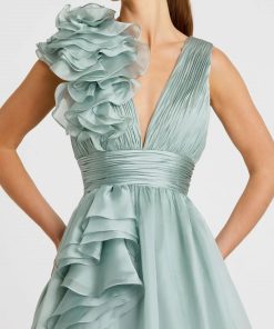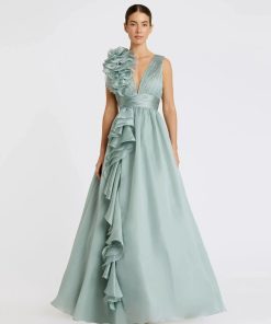 V-neck sleeveless ball gown with ruffled shoulder ruched empire waist and ruffles flowing down the skirt.