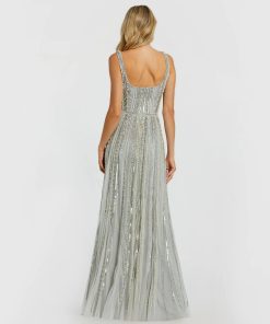 This exquisite a-line gown features intricate striped embellishments that elegantly cascade down the fabric, complemented by a flowy silhouette that drapes effortlessly. A timeless and sophisticated piece, perfect for weddings, galas, and any regal occasion.