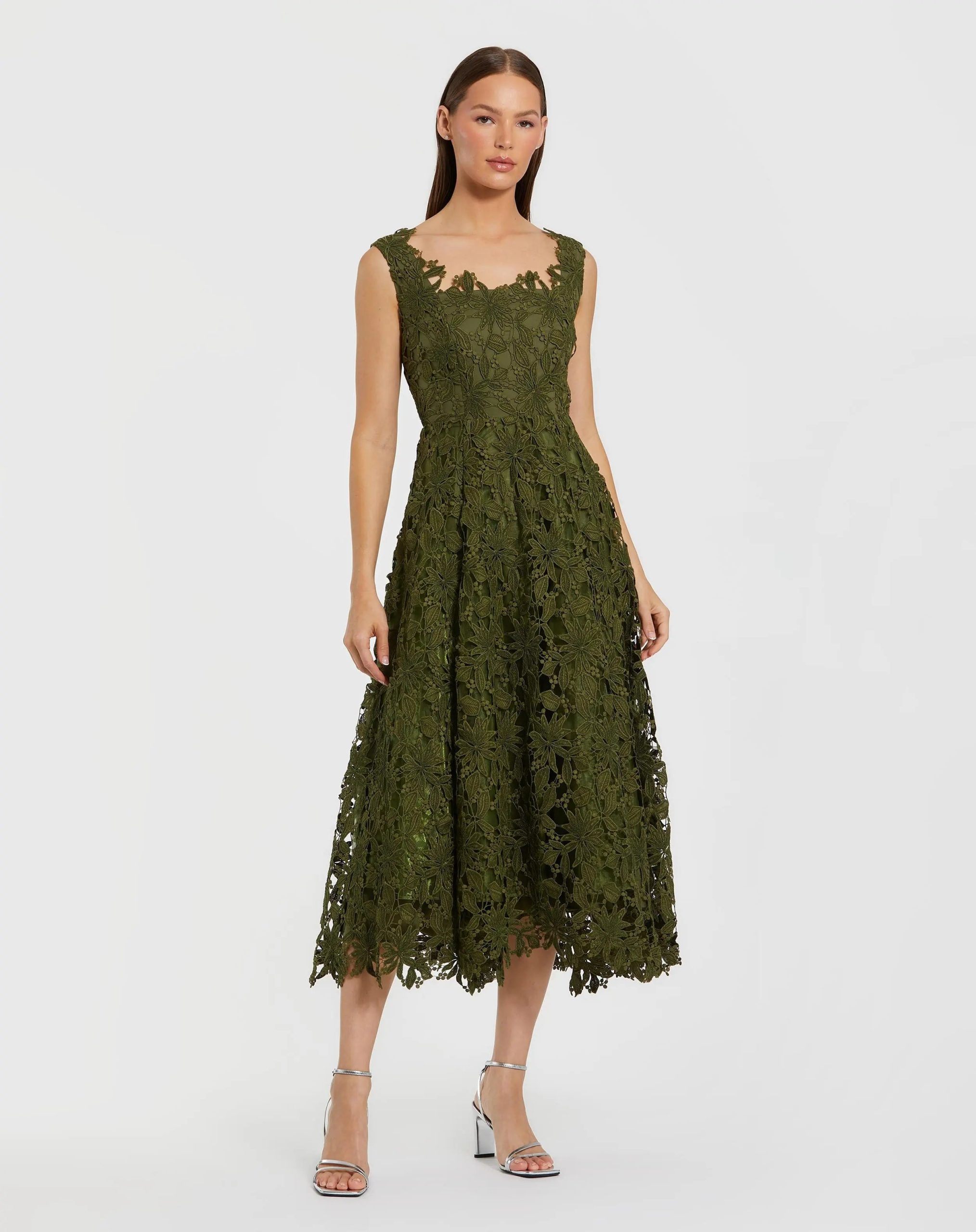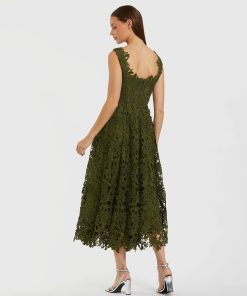 Mac Duggal Women’s Dresses Green Sleeveless Embroidered Lace A Line Midi Dress | Army Green