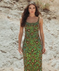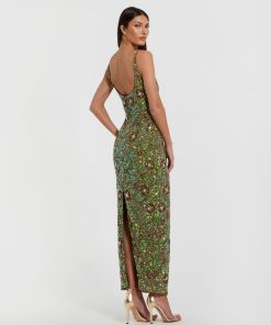 Adorned with intricate beading and sequins, this glamourous maxi dress features a scoop neckline, sleeveless design and a flattering fitted column silhouette. Perfect for cocktail parties and soirees.