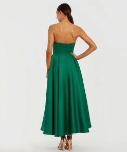 Mac Duggal Women’s Dresses Green Strapless Satin A Line Midi Dress With 3d Flower | Green