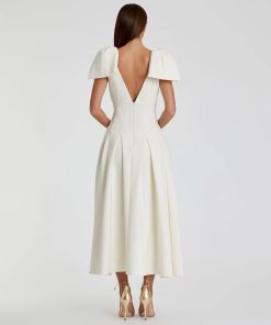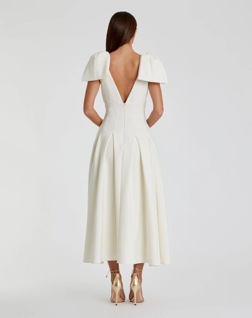 Mac Duggal Women’s Dresses Ivory Crepe A Line Midi Dress With Bow Straps