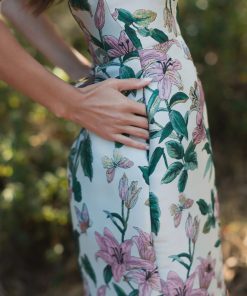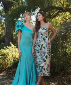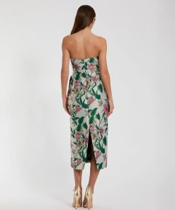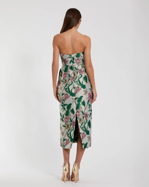 Embody sophistication in this strapless brocade midi dress, featuring a lush tropical floral fabric and an elegant silhouette, perfect for brunches, garden parties, and soirées.